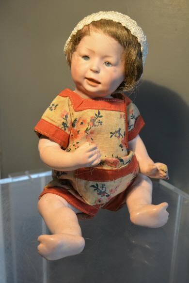 Originaler Sitzbabykörper, nur leicht bespielt, ein Fingerchen restauriert. Originale Farbgebung.